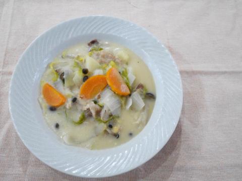 1. 豚肉に塩コショウを振る。じゃがいもは一口大に、人参は半月切りに、玉ねぎは宇くし切りに、白菜は食べやすい大きさに切る。しめじは石突を落としてほぐす。
