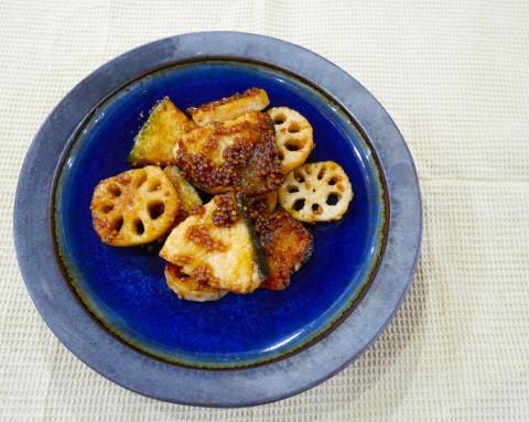- ぶりは食べやすいおおきに切り、Aをまぶして10分程度おき、ペーパータオルなどで水けをふき取る。レンコンとかぼちゃは1㎝幅に切る。